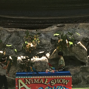 De animals show leek me zoals eerder gezegd wel okƩ! Sommige dieren kwamen gewoon op, zochten eten en gingen dan onmiddellijk terug af het podium. De verschillende vogelsoorten vlogen boven het publiek om het eten (vis) in het water te halen. Een papegaai kwam goocheltrucjes doen of kon fietsen. Het zag er allemaal heel vredelievend uit.